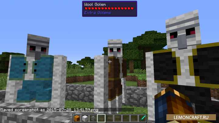 Мод Extra Golems добавляет в игру новые големы, которых вы сможете создавать из различных блоков. В зависимости из каких блоков созданы големы, их характеристики будут отличаться. Теперь у вас появится возможность создать защитника, который сможет отстоять ваши территории от всякой нечисти.